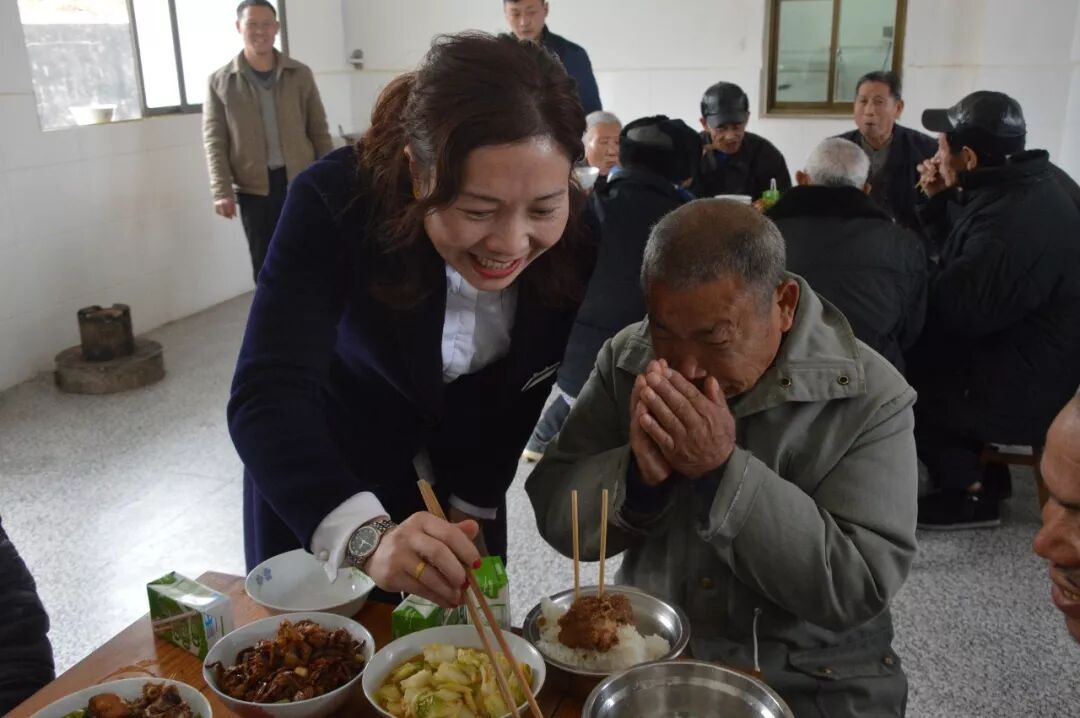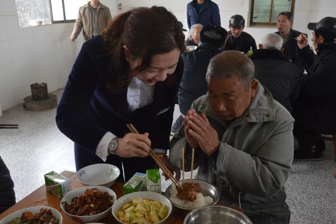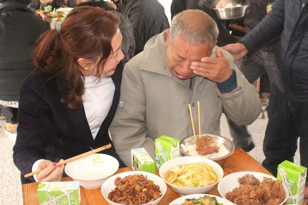 当万象地产工作人员为老人夹菜时,老人激动的热泪盈眶