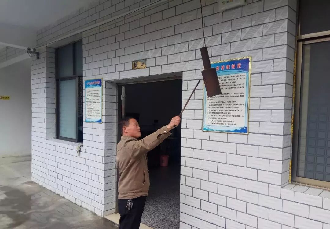 敬老院工作人员敲钟告诉老人们吃饭时间到啦。